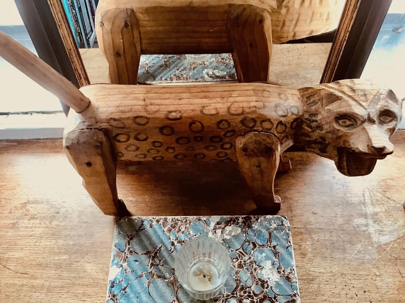 Lo bautizamos Chaac, por razones obvias. Está algo castigado por el sol, porque lo tenemos desde hace décadas tutelando una ventana muy expuesta, pero como buen jaguar maya también sabe lidiar muy bien con la oscuridad de la noche. Nos lo trajimos de Antigua Guatemala, donde hacia fines de los 90 pasamos una Semana Santa tan espiritual como sensorial, parte de un viaje que también supo de ruinas, templos, cenotes y playas en México y Belice. En Antigua descubrimos el embriagante olor del copal, participamos de unas cuantas procesiones, dormimos en un viejo convento dominico devenido hotel de lujo, comimos como los dioses, conocimos colores imposibles. Y seguimos convencidos, 25 años después, de que Chaac protege nuestra casa.