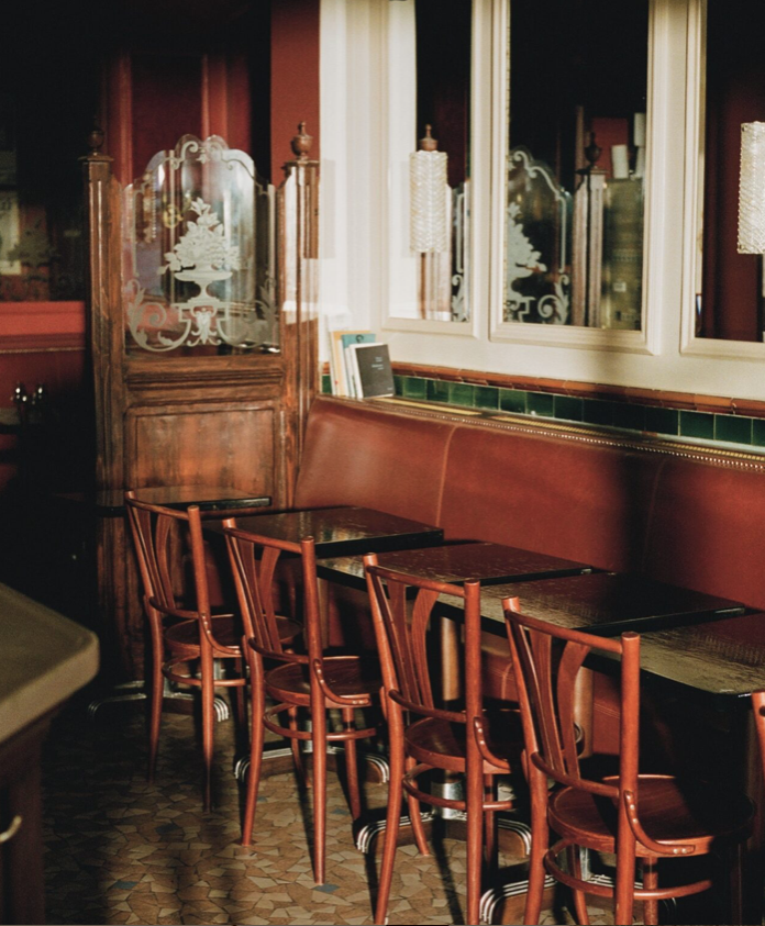Para la aventura de Au Rêve, sumaron a Mathieu Renucci, que había estado a cargo de la cocina durante un tiempo cuando Elyette se retiró. La ambientación interior ha sido revivida muy sutilmente. Defensor de la economía circular y enemigo de los rediseños radicales, Ricardou (que además nació muy cerca del café) afirma que el mejor elogio es escuchar “parece que no hicieron nada”. Los pisos de mosaico están intactos, las banquetas de cuero han sido retapizadas en el mismo tono, sobreviven la barra de madera labrada y el salón revestido en terciopelo rojo, y la eliminación de viejas capas de pintura reveló un fresco que un par de generaciones de clientes ignoraba por completo. Por cierto, el clásico neón de la entrada ha vuelto a brillar.