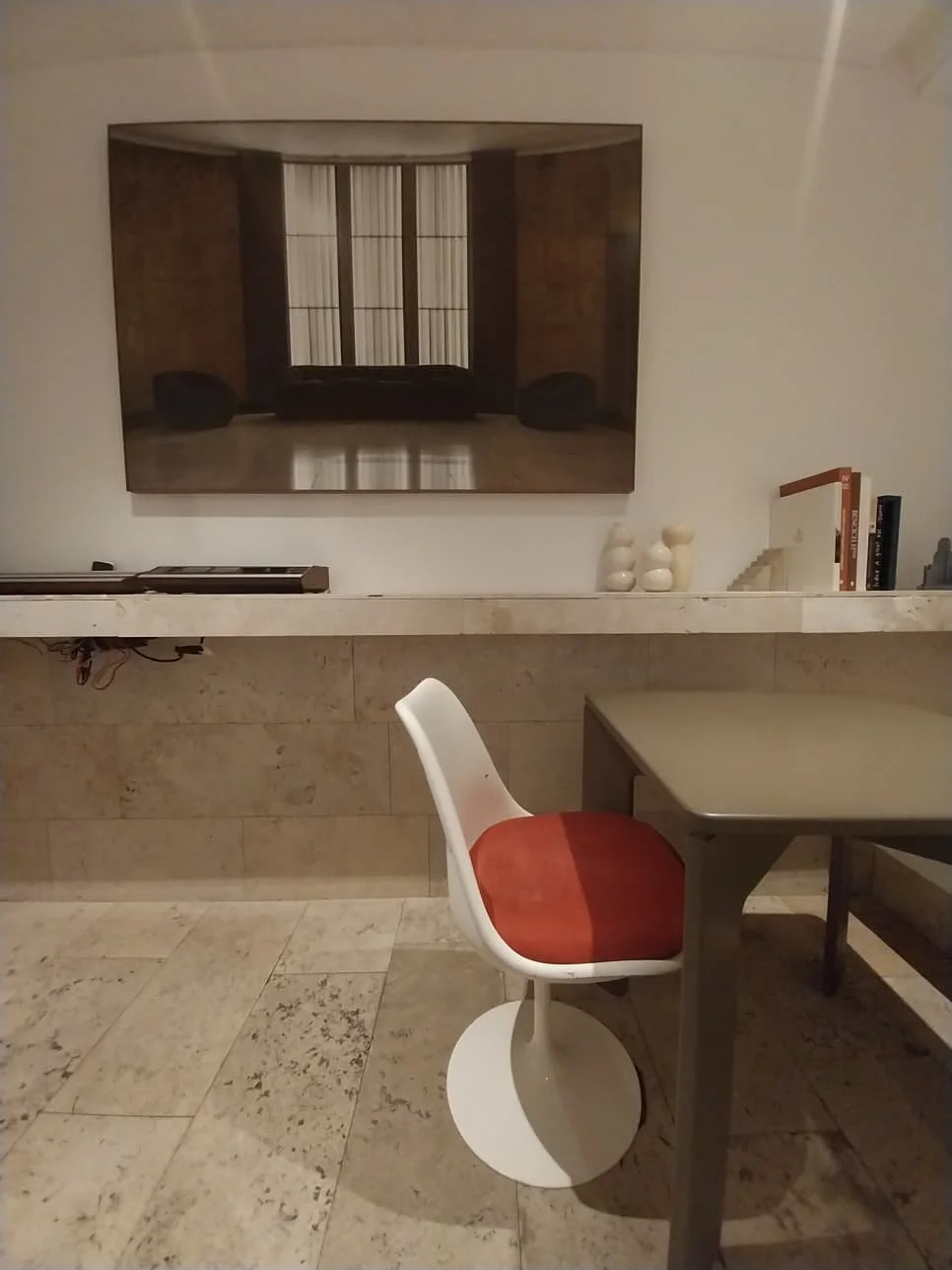 El interior del café está envuelto en un travertino que se emparenta perfectamente con el del suntuoso hall de entrada, toma la barra y parte de las paredes del local; las viejas columnas facetadas de hormigón, antes ocultas, fueron recuperadas y tratadas con un “martelinado” que las descascaró elegantemente; la limpieza visual y el dominio de las líneas largas se compadece con la austeridad general del edificio; las lámparas que cuelgan sobre la barra fueron compradas en un anticuario, las mesas diseñadas por el dueño de casa y las sillas llevan la firma de Ricardo Blanco. Es el lugar perfecto para una pausa. O para seguir husmeando en la historia de este edificio que evoca a “la Pampa puesta de pie”.