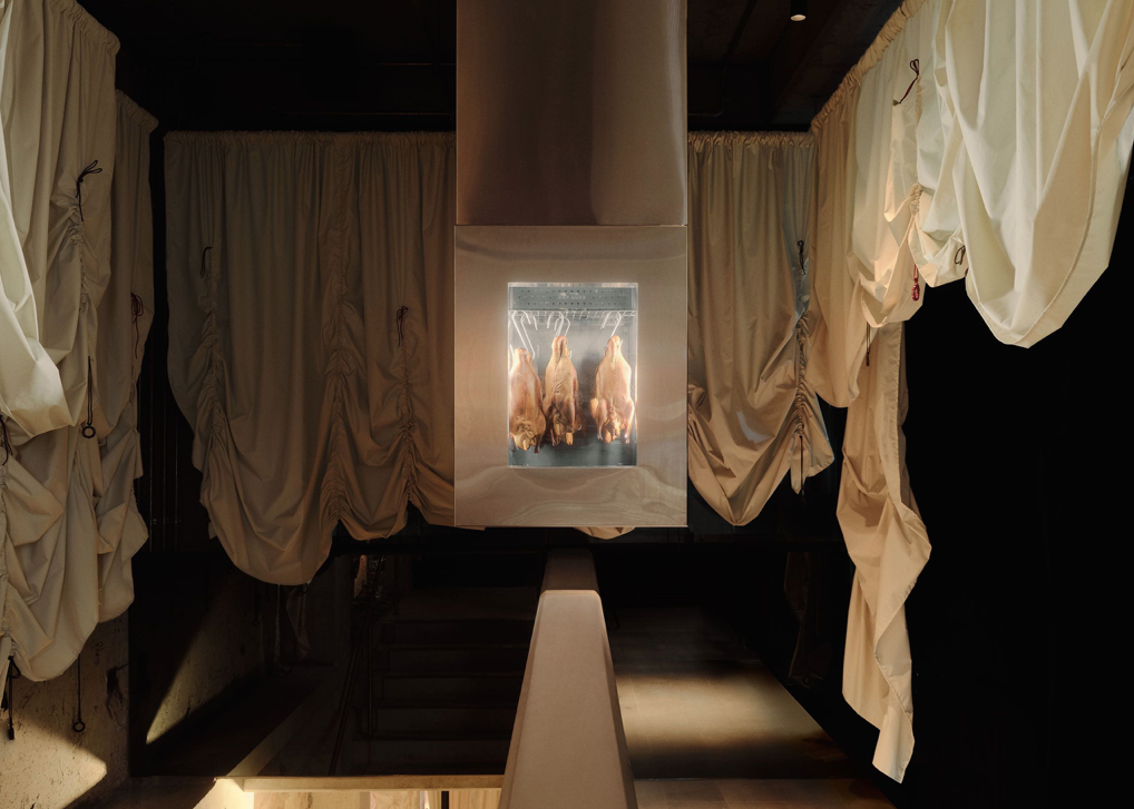 Los mínimos toques de calidez corren por cuenta de la madera encerada de las mesas, las telas drapeadas con aires de telones teatrales que ofician de separadores aquí y allá, y dicen están inspiradas en los andamios de malla de las obras en construcción.