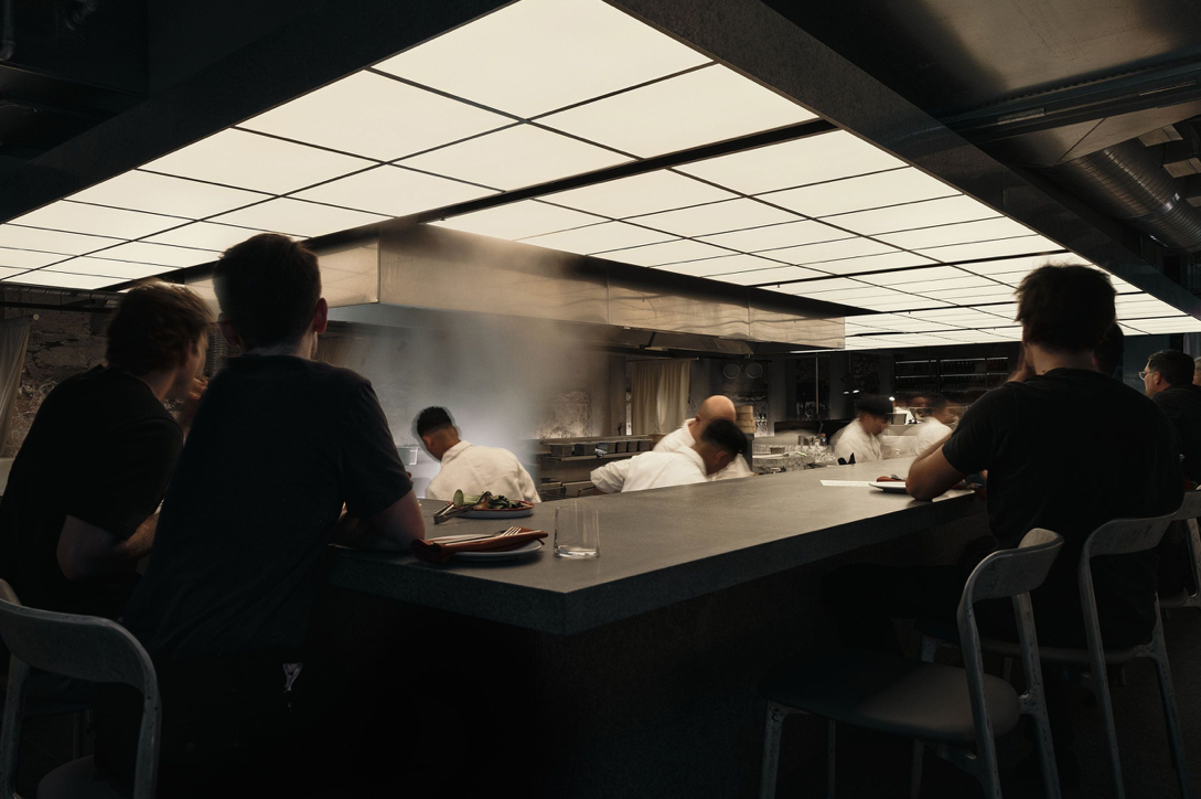 El punto focal del lugar es, como cabe esperar, la cocina abierta, que aquí también está elevada respecto del resto de la superficie. Rodeada por barras y mesas comunitarias, está iluminada por un techo de rejilla que la baña de brillo y la destaca de todo el resto.